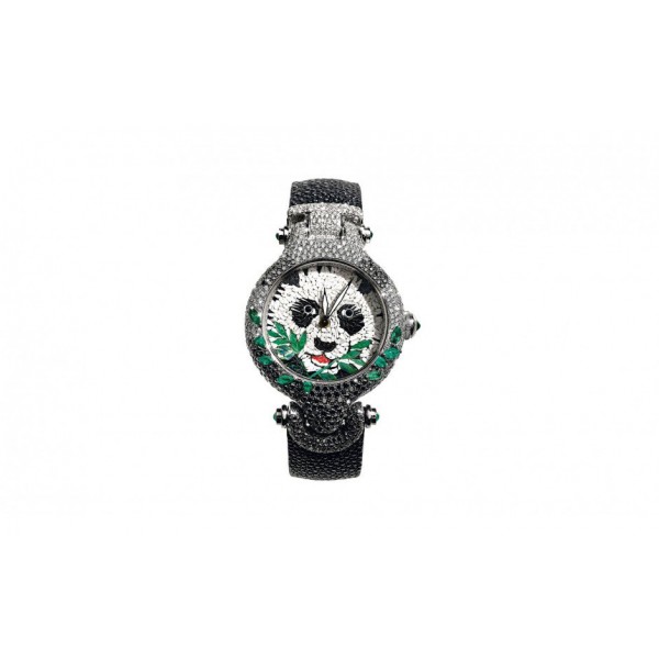 18kt beyaz altın, elmaslar, kara elmaslar ve zümrütler ile mikromozaik saat.